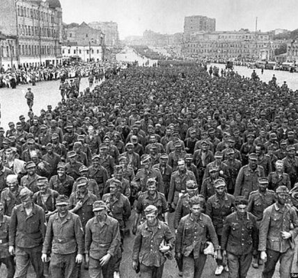 Parade von 57.000 deutschen Kriegsgefangenen in den Straßen Moskaus. Unter Eskorte 1944. Im Sommer 1944 startete die Sowjetunion die Operation Bagration, eine groß angelegte, komplexe Offensive gegen die Nazi-Invasoren in Weißrussland, Polen und den baltischen Republiken. Diese entscheidende sowjetische Offensive…